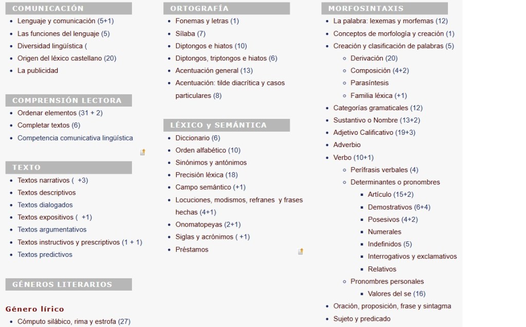 Esta entrada fue publicada en ADJETIVO, ADVERBIO, ANALOGÍAS VERBALES, CAMPO LÉXICO, CAMPO SEMÁNTICO, DETERMINANTE, DIPTONGO, HIATO Y TRIPTONGO, EXPRESIÓN, FAMILIA DE PALABRAS. LEXEMA Y MORFEMA. PREFIJO Y SUFIJO., GENTILICIOS, MÉTRICA Y RIMA, ONOMATOPEYA, ORACIÓN, PALABRAS ANTÓNIMAS, PALABRAS SINÓNIMAS, PRONOMBRE, REFRANES Y FRASES HECHAS, REGLAS DE ACENTUACIÓN, SÍLABAS, SIGLAS Y ABREVIATURAS, SUSTANTIVO, VERBO. Guarda el enlace permanente.